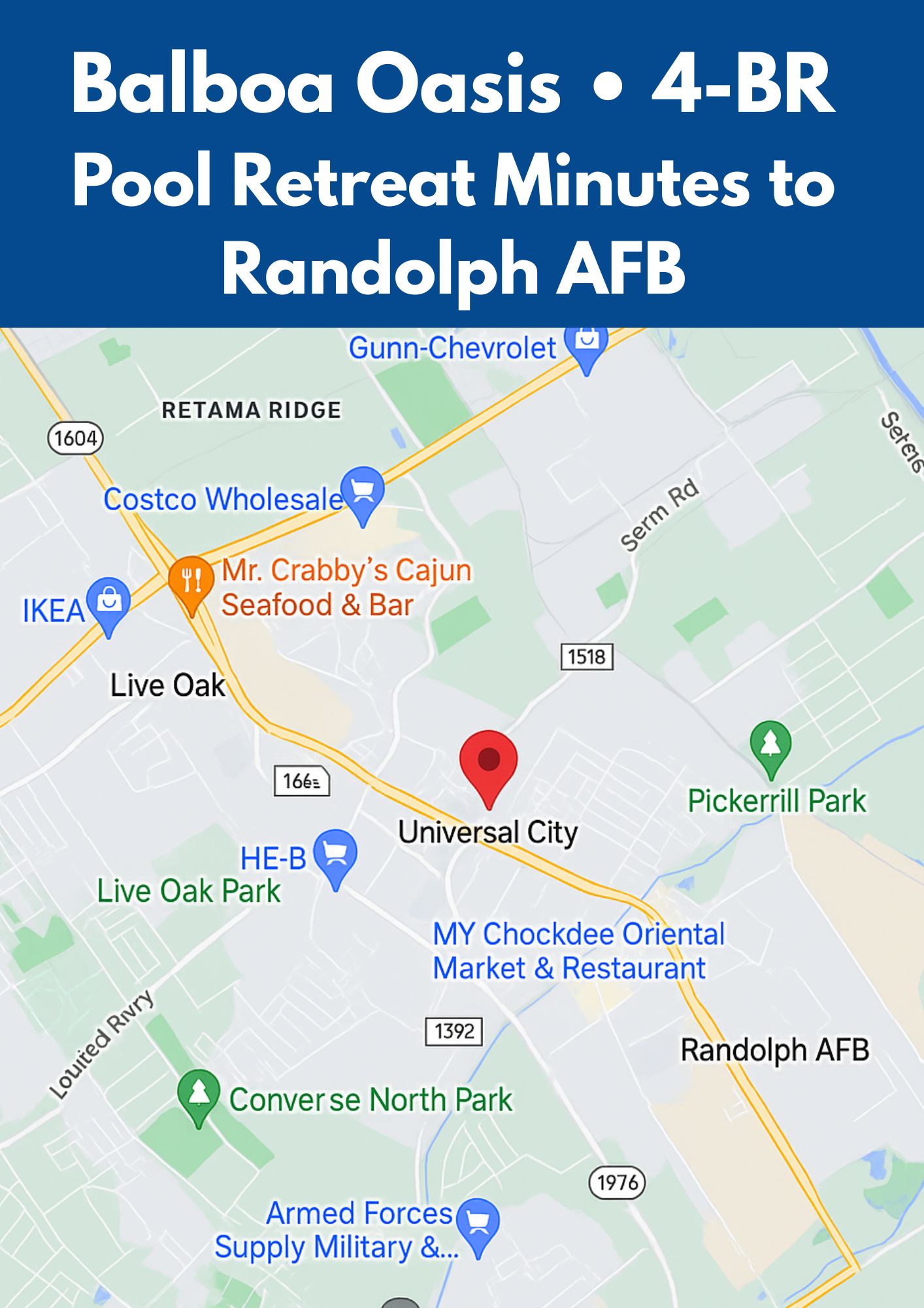 Balboa 1 is a fully furnished 4-bed, 2-bath home designed for longer stays. Enjoy a private pool, covered patio with seating, fast Wi-Fi, smart TVs, and an in-home washer/dryer. A well-equipped kitchen, comfortable bedrooms, on-site parking, and smart-lock entry keep daily life smooth. Set on a quiet street minutes from Randolph and an easy commute to downtown, hospitals, and key employers, it’s a practical, restful base for extended time in San Antonio.